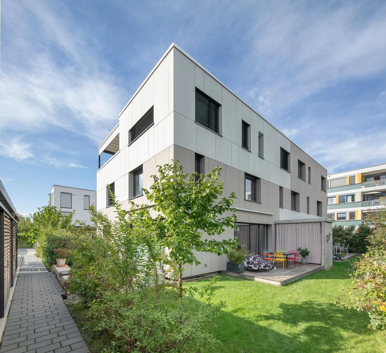 Die Nachverdichtung ging einher mit der energetischen Sanierung. Alle vier Gebäude wurden um ein Geschoss erweitert. Aus statischen Gründen, geringes Eigengewicht und Erdbebennachweis, bot sich eine Realisierung in Holzbauweise an. Diese Maßnahme zur Nachverdichtung des Quartiers schafft 24 neue Drei-Zimmer-Wohnungen, mit einer Gesamtwohnfläche von etwa 1.880 m². Die Aufstockung ist durch einen Materialwechsel von Putz, im Bereich der Bestandsgeschosse, zu einer vorgehängten Plattenfassade im Bereich der Erweiterung gut ablesbar. Das neue Farbkonzept unterstreicht die Zusammengehörigkeit der vier Gebäuderiegel.