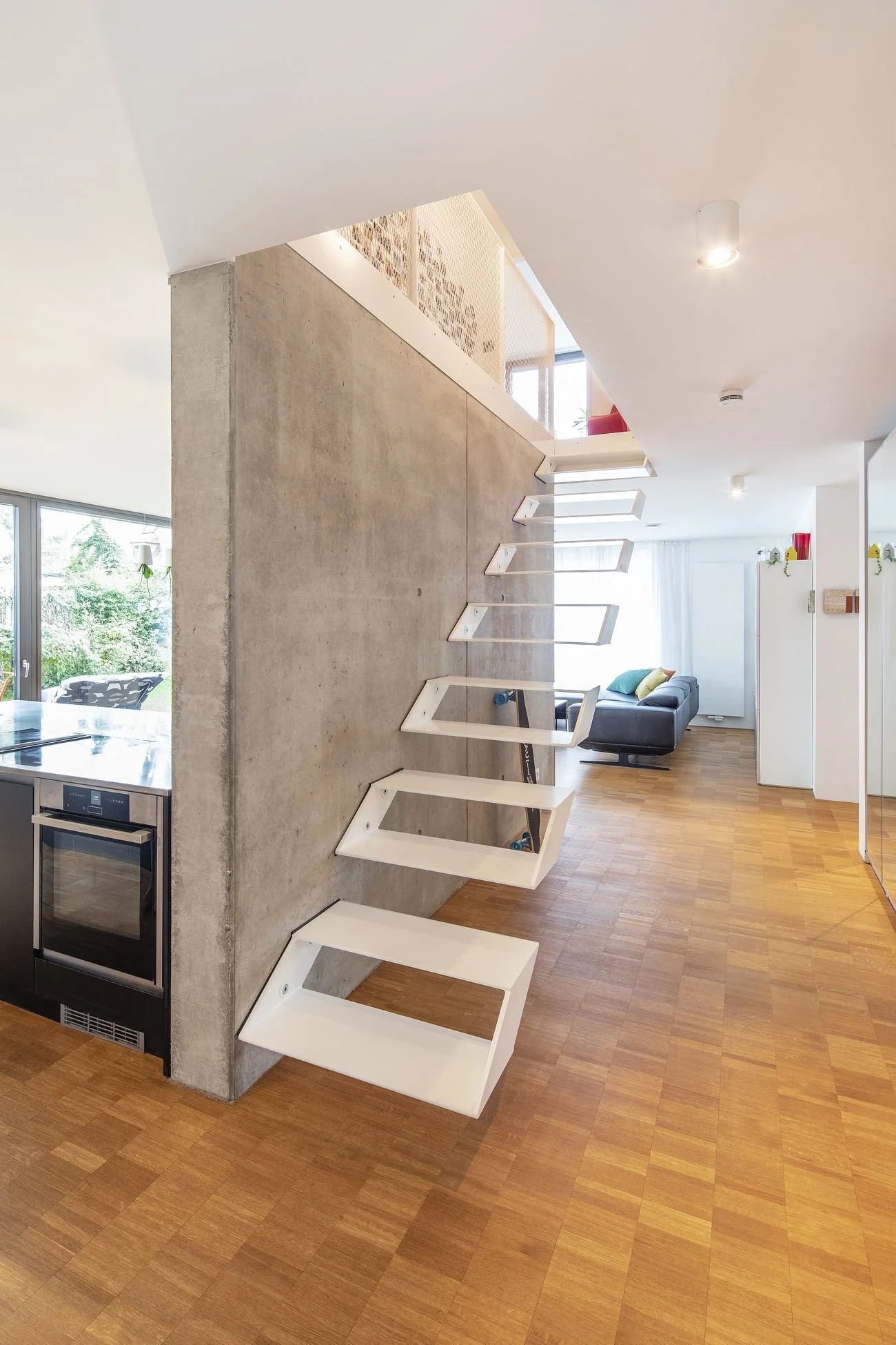 Das energetische Sanierungs- und Modernisierungskonzept wurden miteinander kombiniert und dabei Synergien herausgearbeitet. Die Kubatur des Gebäudes wurde vereinfacht, indem die Flächen der alten Loggien den vorhanden kleinen Bädern zugschlagen wurden. Die Dämmung der Gebäudehülle wurde hierdurch maßgeblich vereinfacht, gleichzeitig entstanden großzügige Bäder. Für zusätzliche Nutzfläche und eine Aufwertung der Grundrisse sorgen die großzügigen, freistehenden Balkonanlagen. Im Bereich der Treppenhäuser wurden sämtliche Wohnungseingangstüren ersetzt und die, zuvor beengte Eingangssituation im Bereich der Hauseingänge durch die Erweiterung um einen Windfang entzerrt. Die komplette Elektro-, Sanitär-, und Heizungsinstallation wurde erneuert und die Gebäude an das Fernwärmenetz angeschlossen.